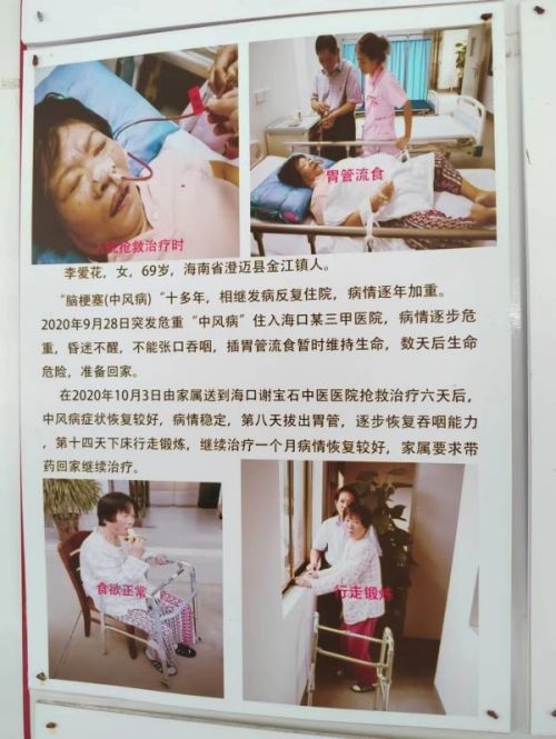 四、治愈中风病或脑血栓后遗症病例:2015年雷州雷城镇吴锡华,中风病,口眼歪斜、语言不清、不能吞咽,肢体活动功能受限,经“宝石液”方药治疗15天出院,生活自如、口眼恢复端正,康复效果满意。2013年雷州杨家镇72岁的王德生,中风病,语言不清、口眼歪斜,左侧肢体偏瘫,经宝石技术治疗14天,病情恢复良好,五官恢复正常、肢体活动功能恢复正常,工作生活自如。2013年雷州市75岁的原审计局局长陈敏,中风病,神志模糊、口眼歪斜、语言不清、不能吞咽,左侧肢体偏瘫,治疗2周,病情恢复原有活动功能,康复出院。